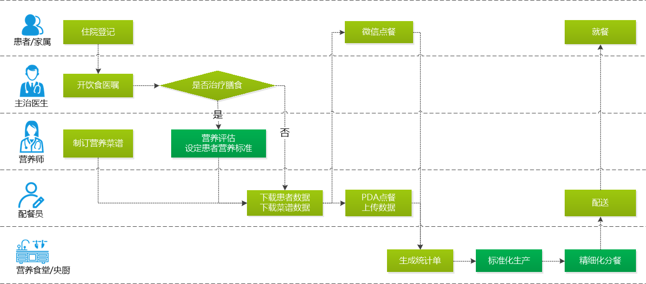 采用PDA或平板點(diǎn)餐,無紙化,自動根據(jù)飲食醫(yī)囑匹配灶類,數(shù)據(jù)可追溯,降低出錯(cuò)率